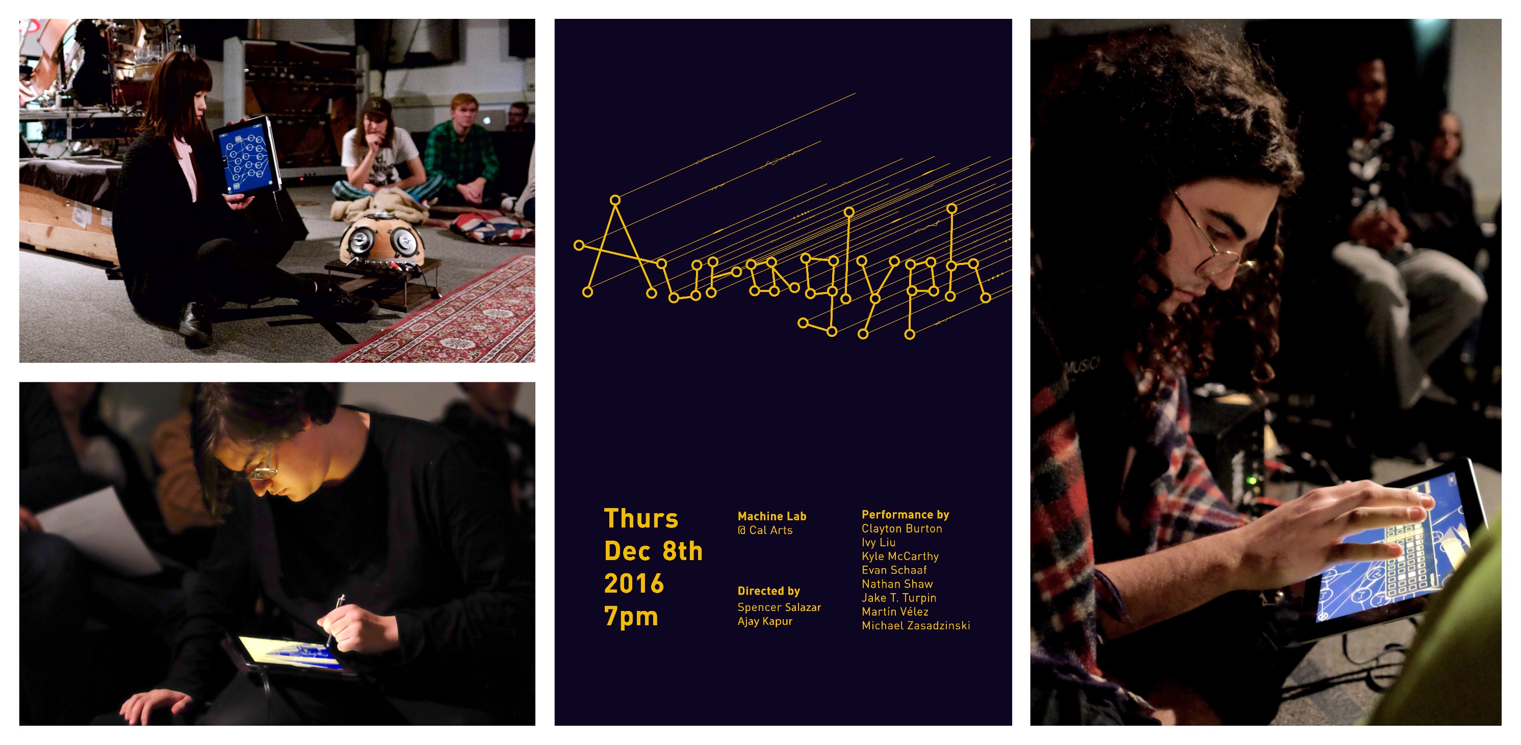 In autumn 2016, the author was invited to perform at a student-initiated concert, TOO LATE IV, and decided to use Auraglyph to compose and perform 20 minutes of original electronic music for the event. This would be the first instance of the author actually producing a musical composition using Auraglyph; previously only short musical demonstrations or test programs had been created. This opportunity was seen as an initial experiment to see if the current version of Auraglyph could be used to create an interesting, satisfying, and/or listenable music experience for the author and an audience. It was not completely certain at the time if that would be possible, given the current state of the software, its creative affordances, and concerns about reliability. Given these concerns, the experiment was viewed as another step in the iterative development process, whose results and conclusions would be used to guide continued refinement and improvement of Auraglyph.