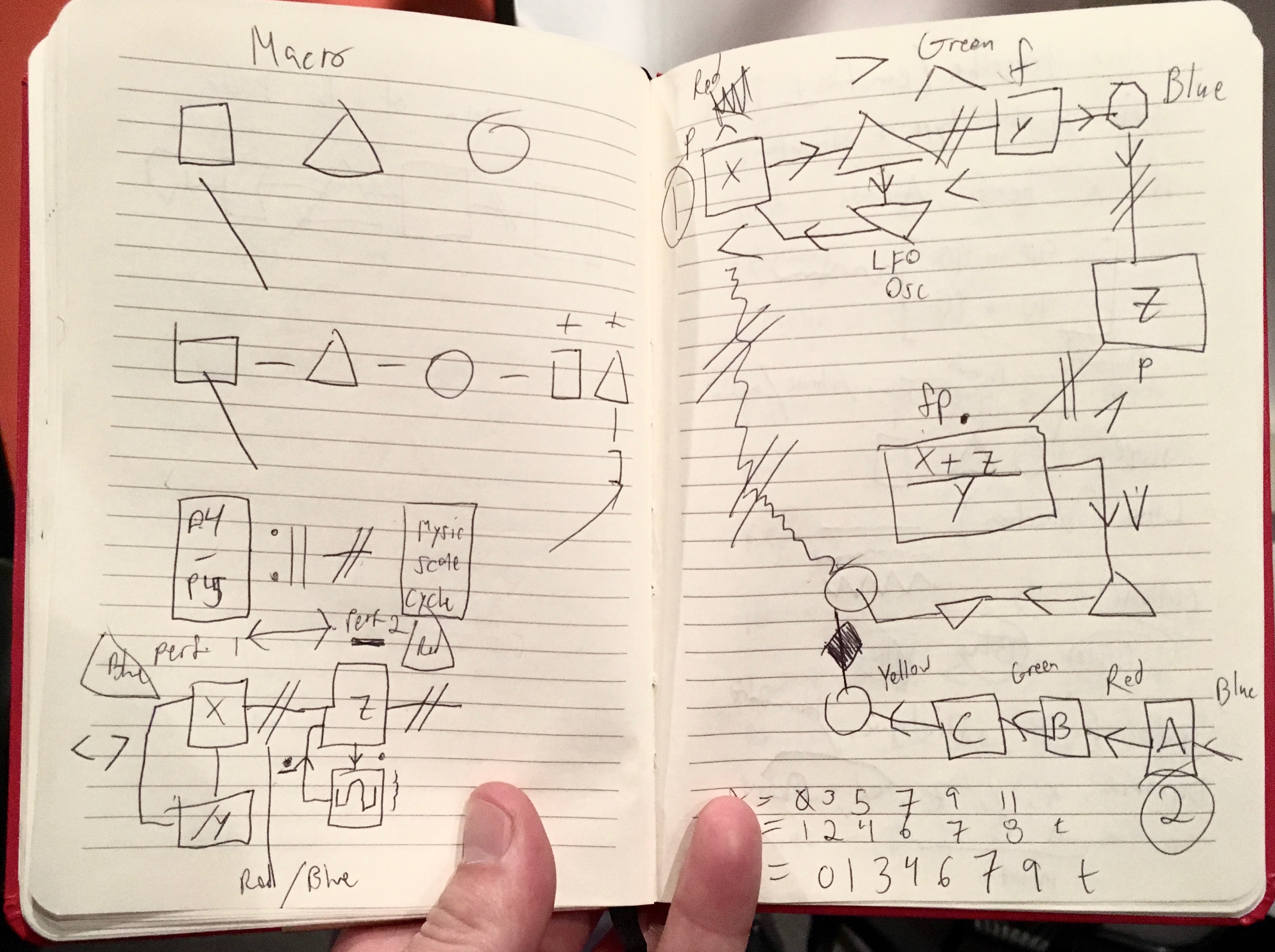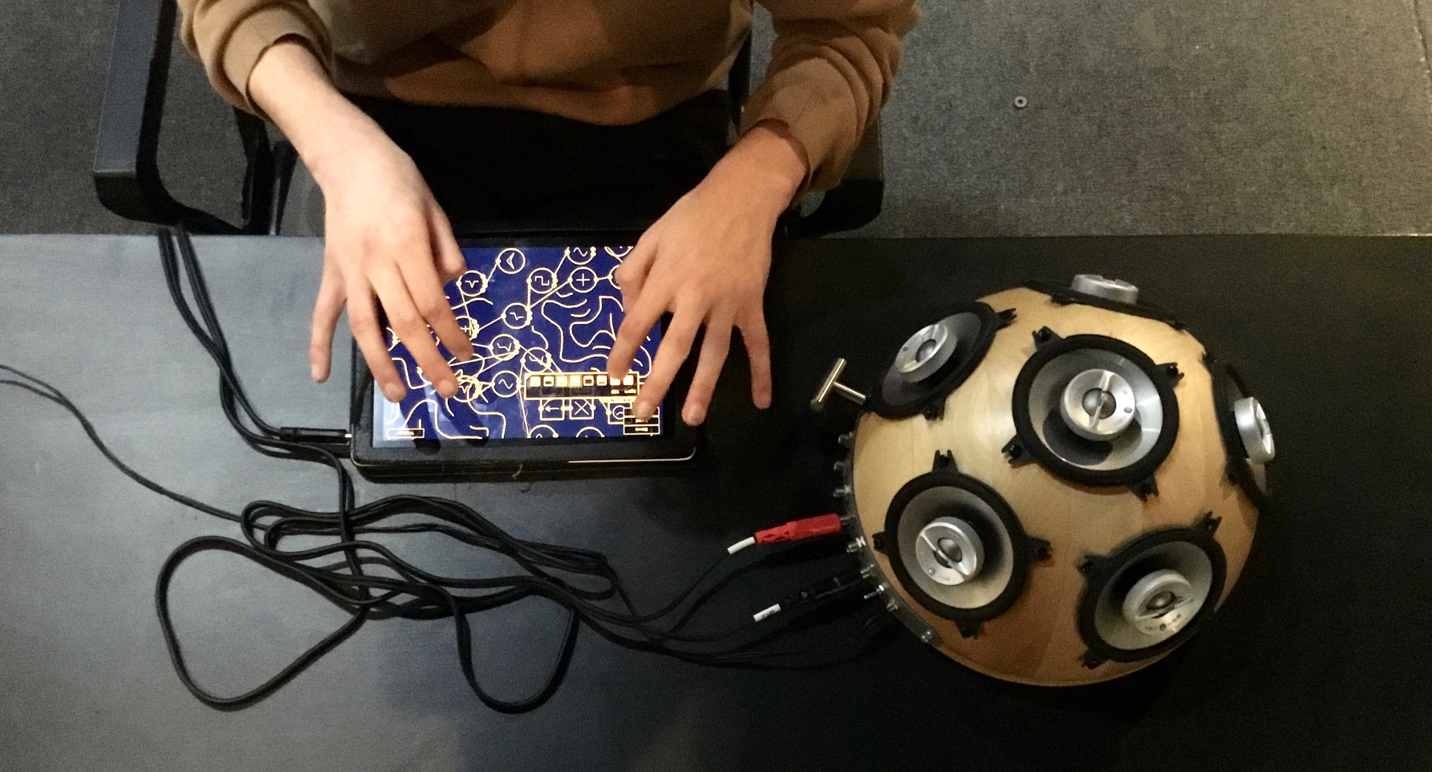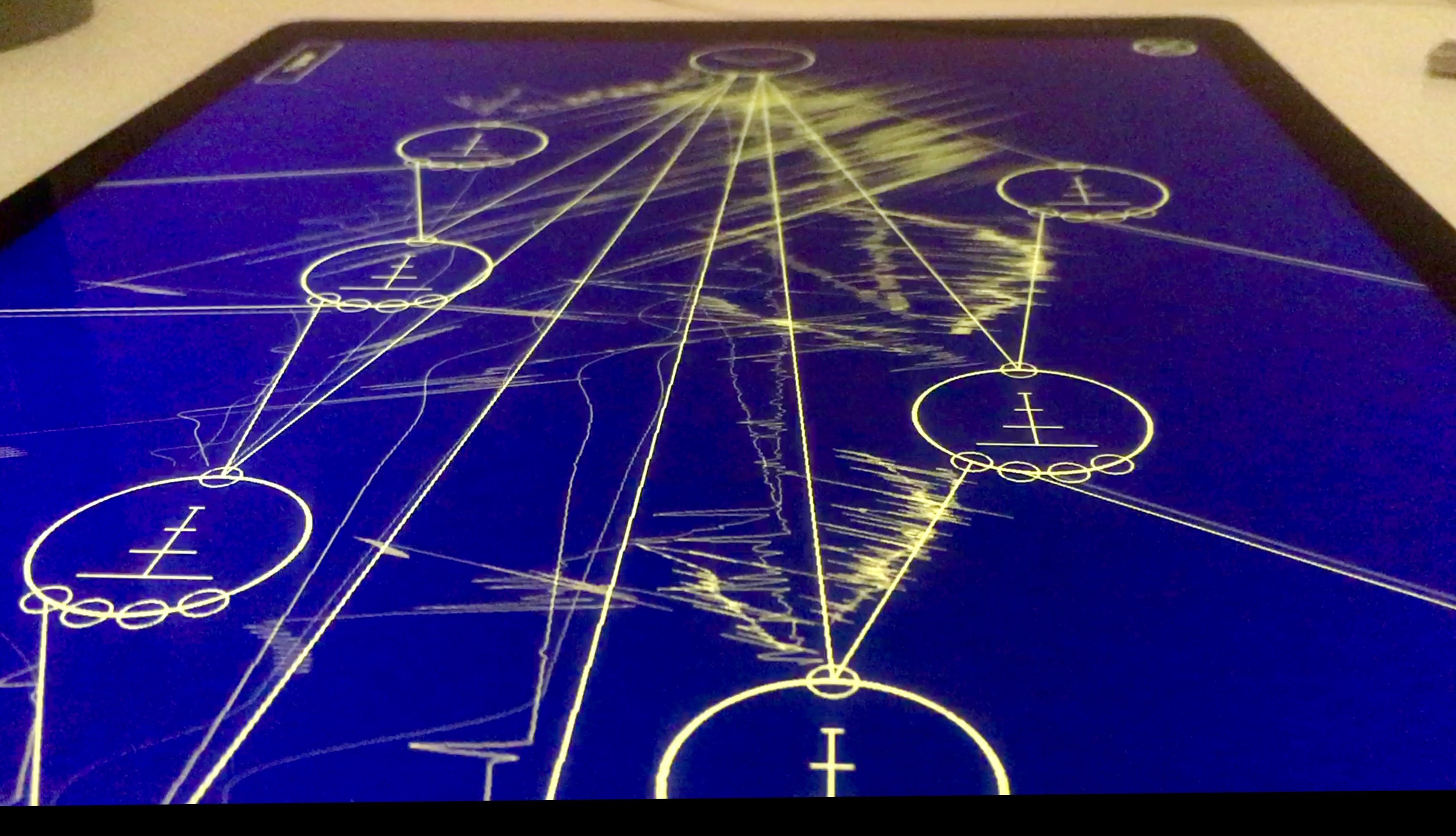 This compositional process transpired over a period of two weeks, resulting in two compositions of roughly ten minutes in length. The original intention was to use two iPads, each with Auraglyph installed, and alternate between the two, creating a richly textural, continuous musical experience. miniAudicle for iPad was also considered for adding small sonic elements to the mix. The end result reduced this setup to a single 12.9” iPad Pro preloaded with two Auraglyph programs that would be reconfigured and augmented over the course of the performance. Each patch roughly corresponded to one “song.”