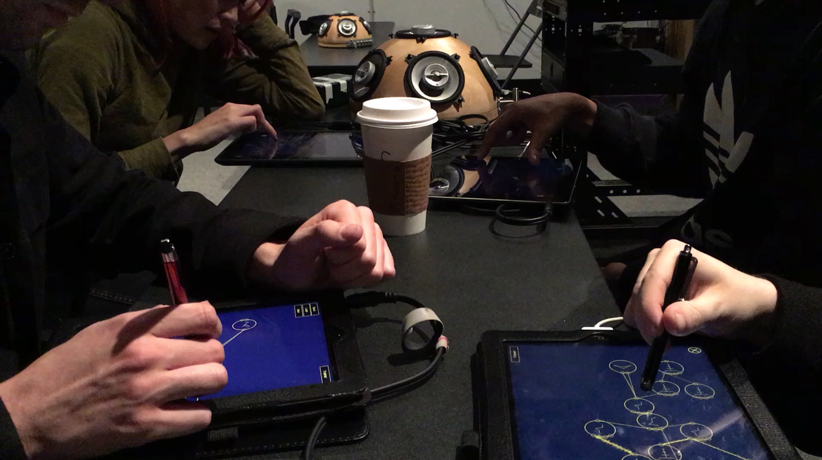 In autumn 2016, students in the author’s CalArts course “Composing for Robots” participated in a user study for Auraglyph. The study was structured in two main parts, the first consisting of individual use with quantitative analysis and the second involving groups of the students using Auraglyph to compose concert works.